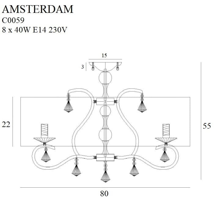 Dzięki wymiarom średnica 80 cm i wysokość 55 cm lampa stanowi efektowny punkt centralny pomieszczenia, jednocześnie zachowując proporcje odpowiednie do większości standardowych wnętrz. Klasa ochrony IP20 wskazuje na przeznaczenie do użytku wewnętrznego. Produkt należy do kolekcji Amsterdam i wpisuje się w nowoczesny styl z nutą klasyki.