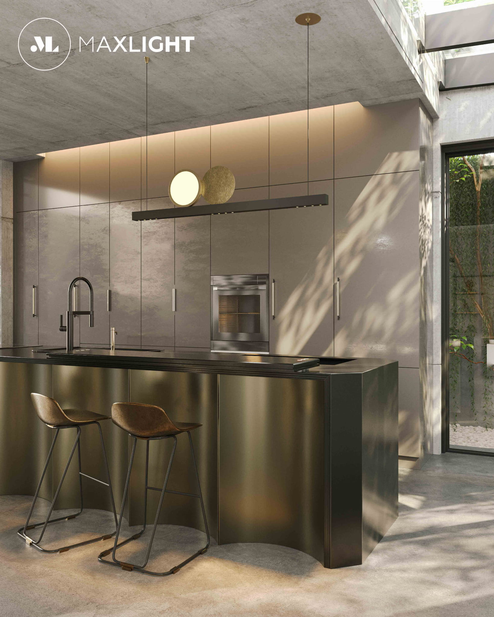 Wyjątkowy charakter lampy podkreślają asymetrycznie rozmieszczone, okrągłe lusterka we wnętrzu profilu, wykończone w eleganckim brushed gold, które tworzą wrażenie ruchu i nadają kompozycji artystyczny wyraz. Połączenie czarnego korpusu z dodatkami w tonacji złotej sprawia, że lampa doskonale komponuje się ze stylami minimalistycznym, loftowym, japońskim oraz z aranżacjami inspirowanymi op-art.