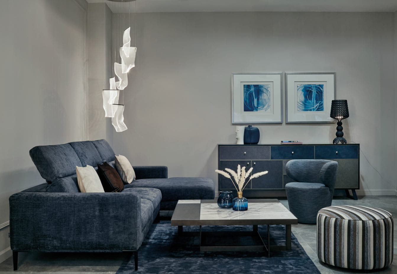 Projekt lampy został opracowany z myślą o elastycznym dopasowaniu do różnych aranżacji — każdy z sześciu elementów świetlnych ma regulowaną wysokość, co pozwala tworzyć kompozycje o różnym charakterze: od symetrycznych układów do dynamicznych, asymetrycznych instalacji przypominających falujący jedwab. Lampa doskonale komponuje się z nowoczesnymi wnętrzami, loftami oraz eleganckimi salonami.