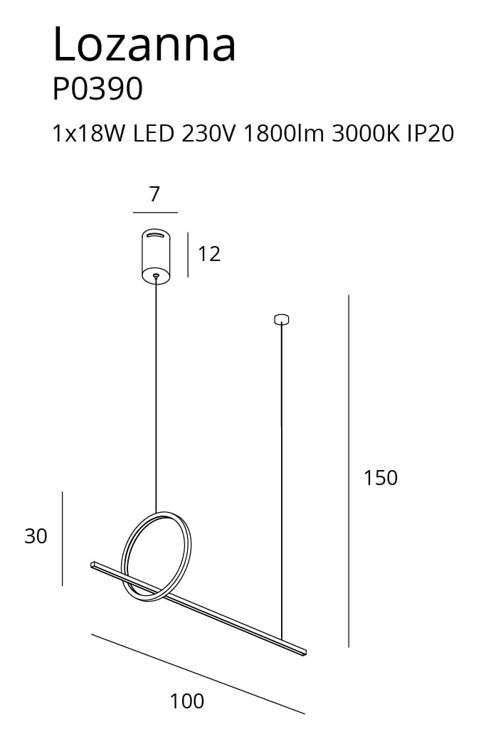 Specyfikacja techniczna została zaprojektowana z myślą o bezpieczeństwie i uniwersalności: zasilanie 230 V, maksymalna wysokość 150 cm, średnica dekoracyjnego elementu Ø 30 cm oraz długość 100 cm. Klasa szczelności IP20 sprawia, że produkt jest przeznaczony do zastosowań wewnętrznych. Konstrukcja umożliwia regulację zawieszenia, dzięki czemu można dopasować lampę do wysokości pomieszczenia.