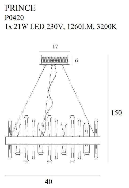 Produkt wyróżnia się także praktycznymi parametrami: maksymalna wysokość zawieszenia to 150 cm, a średnica plafonu wynosi 40 cm, co pozwala dopasować oprawę do różnych układów pomieszczeń. Klasa szczelności IP20 wskazuje na przeznaczenie typowo wewnętrzne, idealne do salonów, korytarzy czy sypialni. Lampa należy do kolekcji Prince, w której dostępne są również inne typy opraw, co ułatwia skomponowanie spójnego zestawu oświetleniowego.